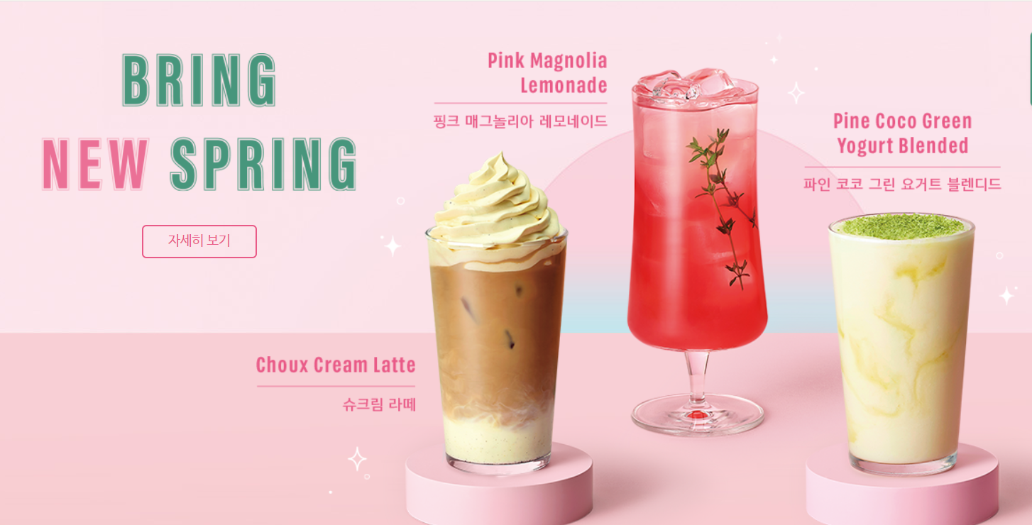 바로 슈크림라떼, 핑크 매그놀리아 레모네이드, 파인 코코 요거트 블렌디드