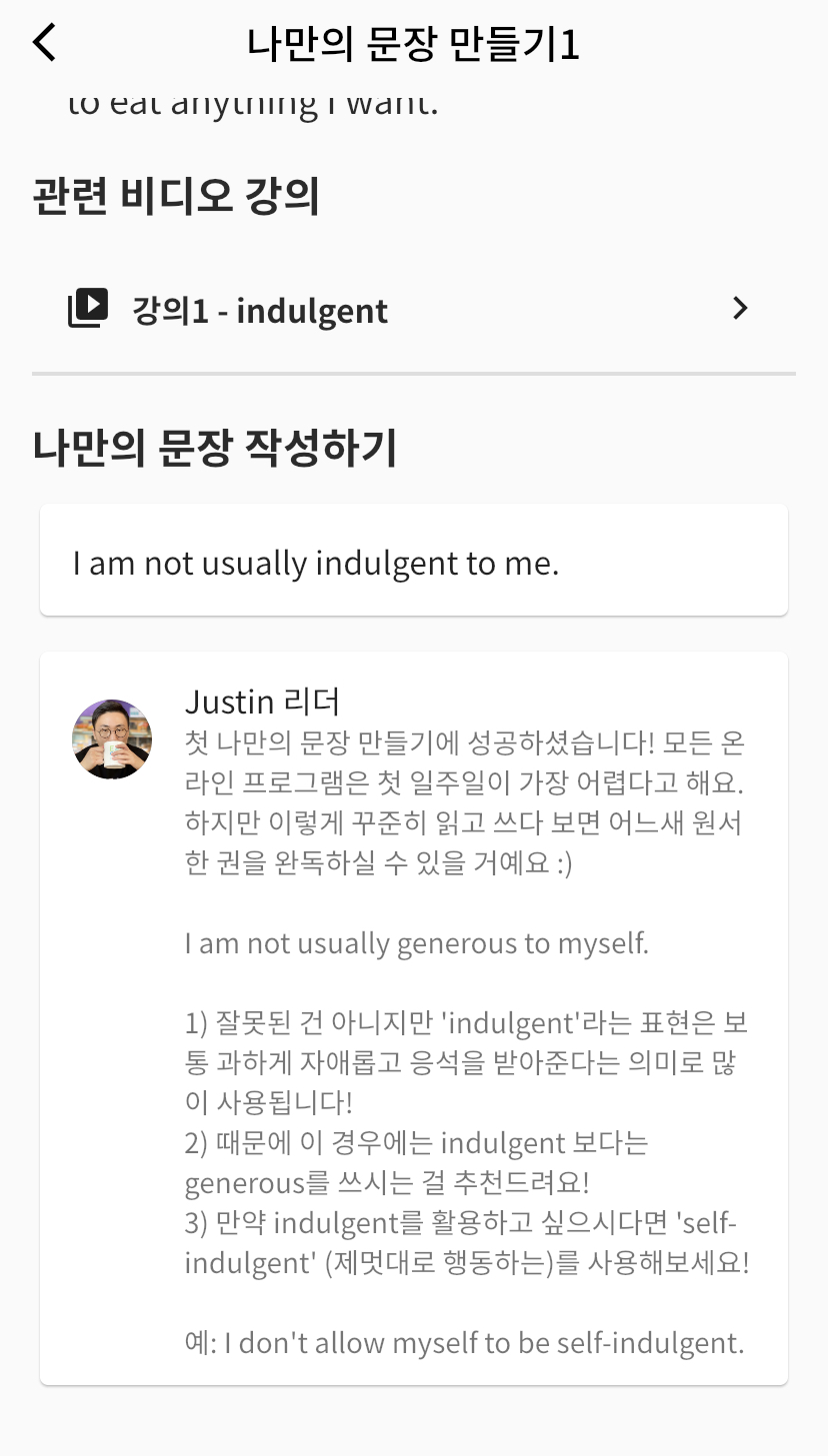 나만의 문장 작성하기 칸에 문장을 적고 제출하기 를 누르면 된다. 피드백을 받기 전까지는 수정하기를 눌러 수정도 가능하다. 오~~피드백이 도착했다. 부끄럽지만, 피드백이 어떻게 오는 지 궁금할 수 있을 것 같아 공개해본다.