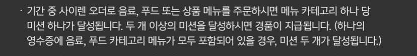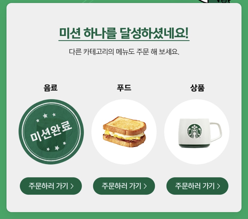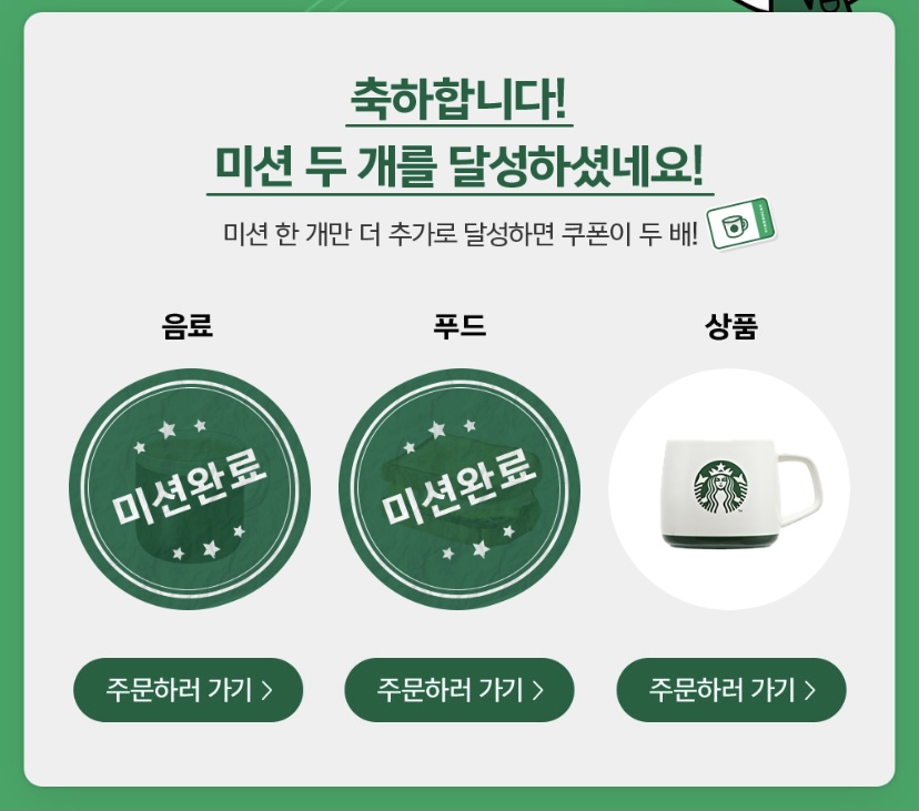 하나의 영수증에(한 번 주문할 때) 음료, 푸드 같이 주문하면 미션 2개 달성이다.