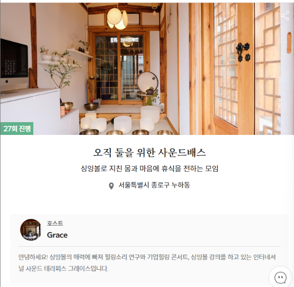 작은 제목에 '싱잉볼로 지친 몸과 마음에 휴식을 전하는 모임'이라고 설명이 되어 있다.