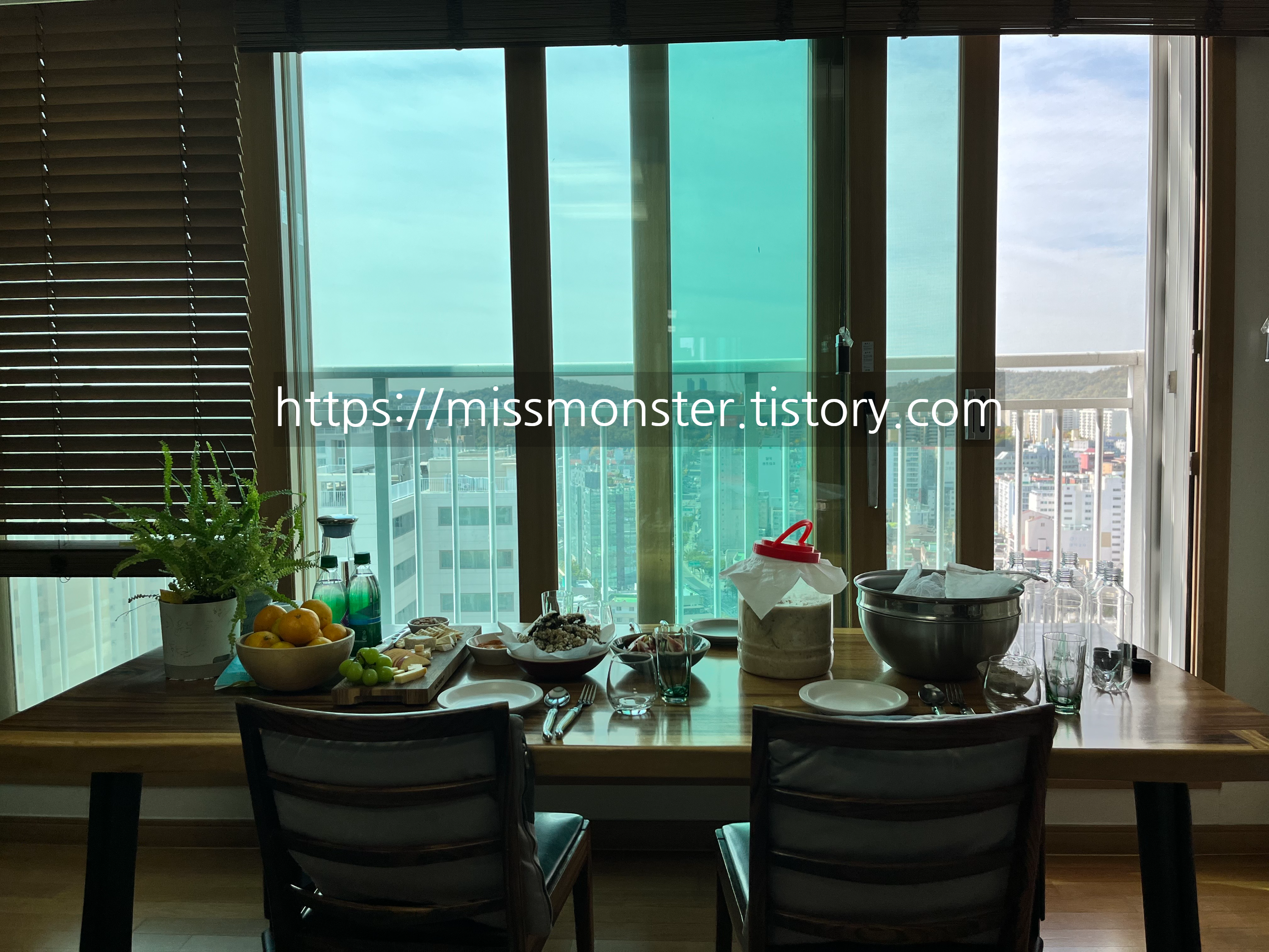 거실 창가 쪽에 놓인 테이블에 오늘 모임을 위한 한 상이 차려져 있다.