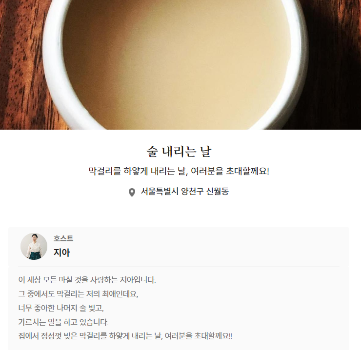 한복을 입은 단아한 모습의 호스트사진 그리고 소개글에 '막걸리를 하얗게 내린다'는 말이 무척 예쁘게 느껴졌다.