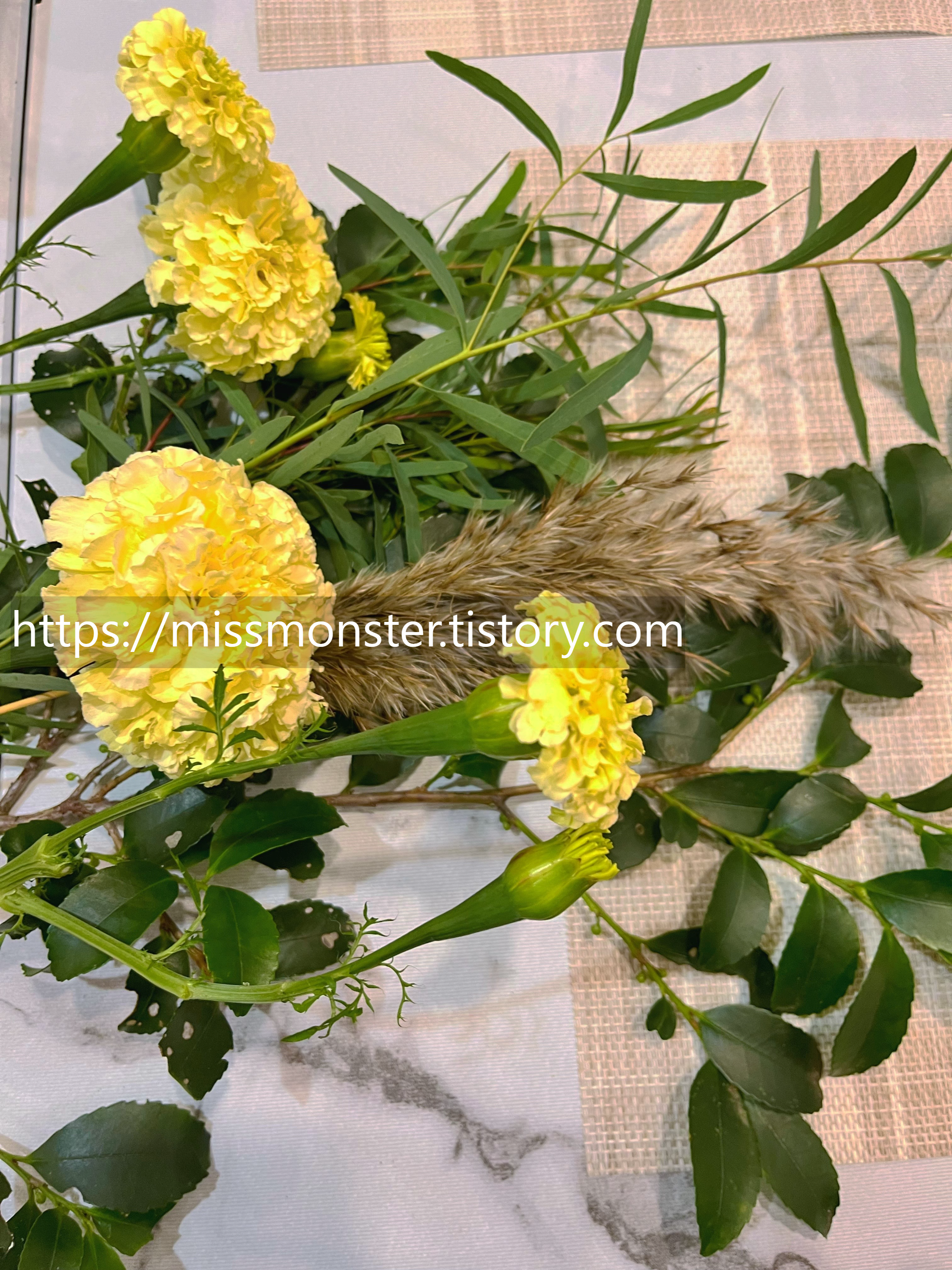 유칼립투스, 메리골드, 카네이션, 장미, 거베라, 스톡, 수국, 갈대...
